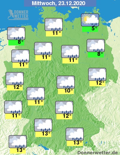 Abgesehen von kurzen Auflockerungen die hauptsächlich im Ostseebereich auftreten halten sich dichte graue Schichtwolken mit Regen und Sprühregen. An den Westhängen der Mittelgebirge dauern die Regenfälle auch längere Zeit an und sind ergiebiger.