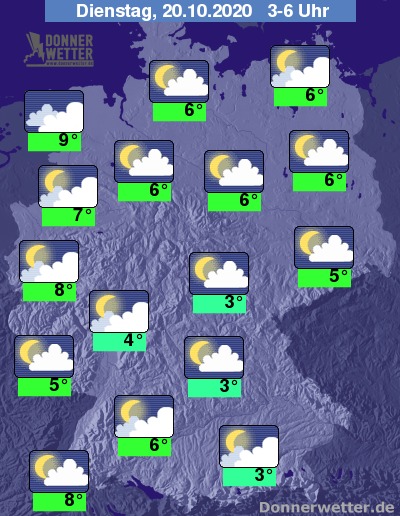 In der Nacht zum Dienstag zeigt sich der Himmel verbreitet aufgelockert bewölkt. Im Laufe der Nacht zieht es sich jedoch oft auch zu, dazu bleibt es trocken. Die Temperatur sinkt auf 9 Grad an der Nordsee und bis 3 Grad in Oberbayern.