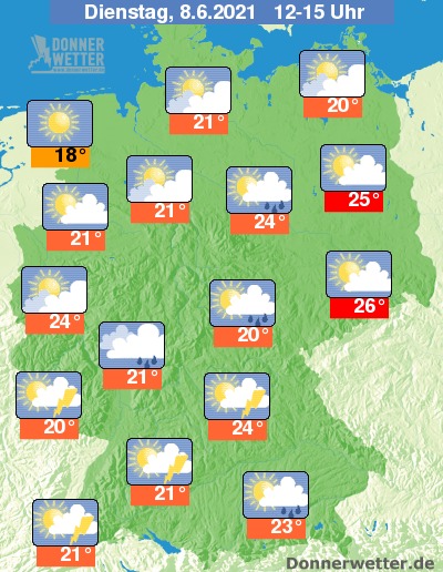 Im Süden und der Landesmitte erhöhtes Unwetterrisiko, Höchstwerte um 20 bis 26 Grad.