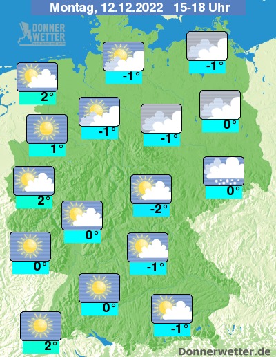 Am Montagnachmittag bleibt der Himmel über dem Osten und Südosten Deutschlands stark bewölkt oder es ist bedeckt, im Südwesten ist zeitweise leichter Schneefall möglich. In den übrigen Landesteilen ist es heiter oder nur leicht bewölkt, vor allem im Westen und Südwesten scheint die Sonne auch längere Zeit von einem wolkenlosen Himmel. Dabei bleibt es trocken.
