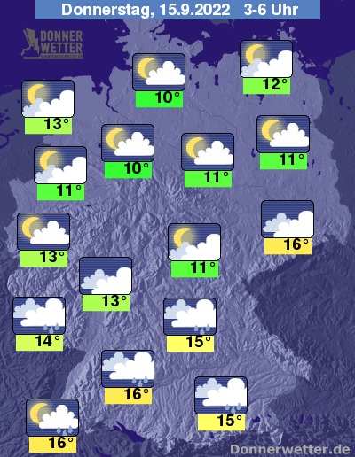 In der folgenden Nacht ist der Himmel über der Nordhälfte der Republik oft nur locker, hier und da jedoch auch stark bewölkt, dazu bleibt es weitgehend trocken. Im Süden bringen kompakte Wolken hingegen zeitweise Schauer. Die Temperatur sinkt auf 16 Grad in München und 11 Grad in Berlin.