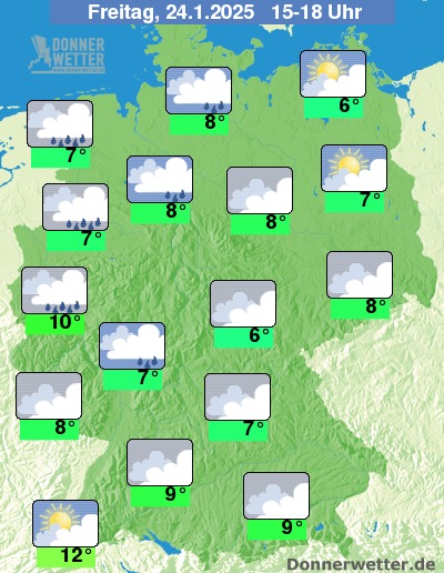 Am Freitagnachmittag zeigt sich der Himmel über weiten Landesteilen stark bewölkt oder bedeckt, Auflockerungen beschränken sich vor allem auf den Nordosten sowie den äußersten Südwesten. Im Westen und Nordwesten fällt dabei zeitweise etwas Regen, sonst bleibt es weitgehend niederschlagsfrei.