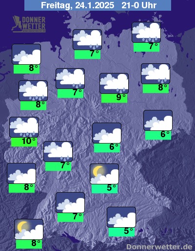 In der Nacht zum Samstag zeigt sich der Himmel über dem Süden teils wolkig, teils gering bewölkt und es bleibt meist trocken. Gebietsweise kann sich Nebel bilden. In den übrigen Landesteilen ist es stark bewölkt oder bedeckt; dabei fällt zeitweise, im Westen auch anhaltender Regen.