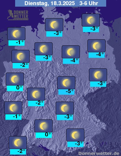 Die Temperaturen sinken in den frühen Morgenstunden auf Werte um -5 bis 0 Grad.