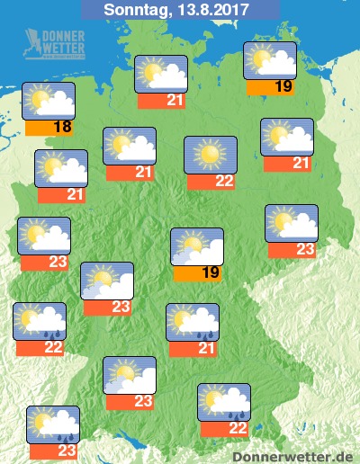 Am Sonntag kann sich die Sonne endlich wieder für längere Zeiten durchsetzen und neben meist lockeren Wolken bleibt es über der Nordhälfte dazu auch weitgehend trocken. Im Süden ist es neben aufgelockerter Bewölkung auch teils stark bewölkt und es können sich einzelne Schauer bilden. Die Temperatur erreicht  etwa 18 Grad an der Nordsee und bis 23 Grad in Köln und Dresden.