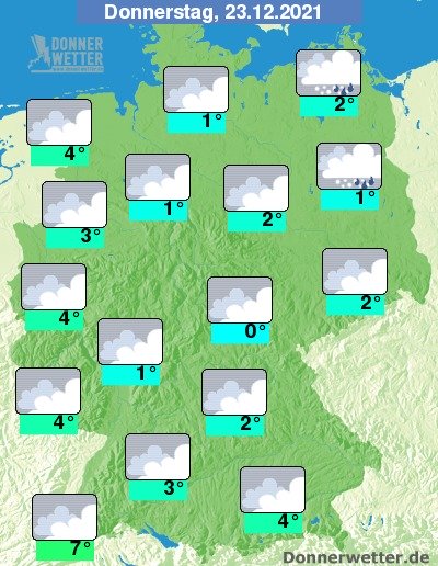 In der Nacht zum Donnerstag lockert es hier und da etwas auf, häufig bleibt es aber stark oder dicht bewölkt. Es fallen nur selten mal ein paar Flocken, zumeist bleibt es trocken. Die Temperatur sinkt auf 1 Grad an den Küsten und bis etwa -4 Grad im Vogtland.