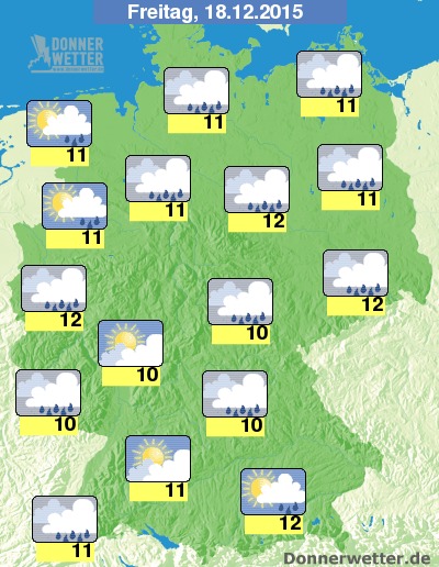 Am Freitag ist es im äußeren Süden zunächst oft aufgelockert oder stark bewölkt und weitgehend trocken, im übrigen Land halten sich zumeist dichte Wolken und es fällt immer wieder Regen. Im Tagesverlauf ziehen auch im Alpenvorland Regenwolken auf, während die Niederschläge vom Westen Deutschlands her wieder abklingen und es nachfolgend auch gebietsweise auflockert. Bis zum Abend regnet es nur noch am Alpenrand, sowie im äußeren Osten des Landes. Vor allem im Norden bleibt es jedoch meist trüb. Die Temperatur steigt auf 10 Grad in Unterfranken und bis 12 Grad am Niederrhein.