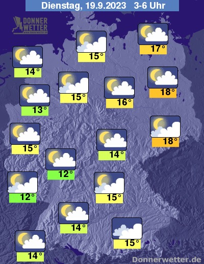 In der Nacht zum Dienstag klingen die Schauer verbreitet ab und es lockert überwiegend auf. Hier und da halten sich aber auch noch dichte Wolken. Die Temperatur sinkt auf 18 Grad in Berlin und bis 12 Grad in Saarbrücken.