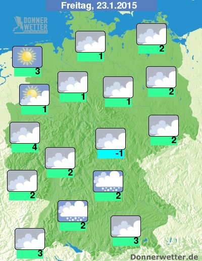 Am Freitag bleiben die Wolken vor allem im Süden und Osten Deutschlands weitgehend dicht und hier fällt zeitweise Schnee, vereinzelt auch Schneeregen oder Regen. Auch in der Nordwesthälfte bleibt es mehrheitlich stark bewölkt, hin und wieder, und hierbei insbesonders im Nordwesten kann sich die Sonne aber zeigen. Dabei bleibt es trocken. Die Höchstwerte erreichen -1 Grad im Vogtland und bis etwa 3 Grad in München.