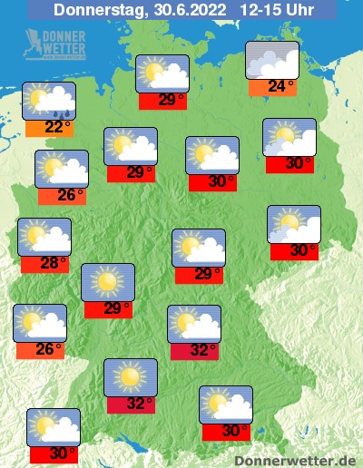 Heute Nachmittag scheint über dem Land häufig die Sonne und es ziehen zumeist nur lockere Wolkenfelder durch, oft ist es auch sonnig. Mehr und teils dichte Wolken halten sich im Küstenumfeld und über den östlichen Landesteilen, dazu besteht ein leichtes Schauerrisiko. Die Temperatur liegt bei 22 Grad im nördlichen Emsland und 32 Grad in Mittelfranken.