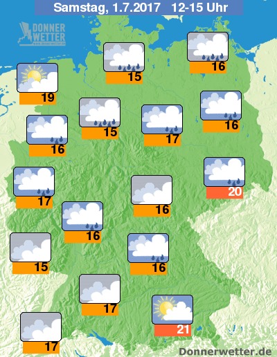 Heute Nachmittag bleibt es im Norden und Westen meist regnerisch. Weiter nach Südosten hin ist es zwar ebenfalls meist bedeckt, jedoch bilden sich hier eher einzelne Schauer. Am freundlichsten zeigt sich das Alpenvorland, hier ist es heiter oder wechselnd bewölkt und weitgehend trocken. Die emperatur liegt bei kühlen 15 Grad an der Weser und bis 21 Grad in München.
