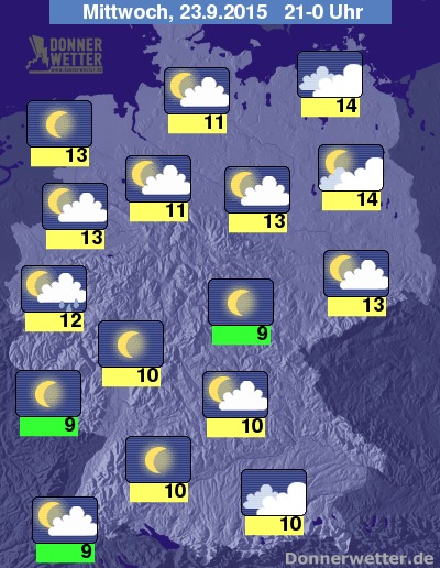Heute Abend halten sich im Südosten noch meist dichte Wolken aus denen hier und da etwas Regen fällt. Auch im Westen sind gebietsweise dichte Wolken mit einzelnen Schauern unterwegs. Über den Nordosten und den äußeren Osten der Bundesrepublik ziehen oft viele und teils dichte Wolken, dabei fällt jedoch kein Regen. Im großen Rest des Landes ist es dagegen überwiegend locker bewölkt und vor allem vom Südwesten bis in die Landesmitte hinein auch oft sternenklar, dabei bleibt es trocken. Die Abendtemperatur liegt bei 14 Grad in Berlin und um 9 Grad am Bodensee.