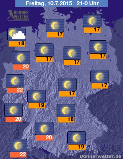 Heute Abend zeigt sich der Himmel über der Bundesrepublik weitgehend sternenklar und nur an der Nordsee ziehen auch mal einige Wolken durch, dazu bleibt es trocken. Die Abendtemperatur liegt bei warmen 22 Grad in Aachen und verbreitet 17 Grad im Nordosten des Landes.