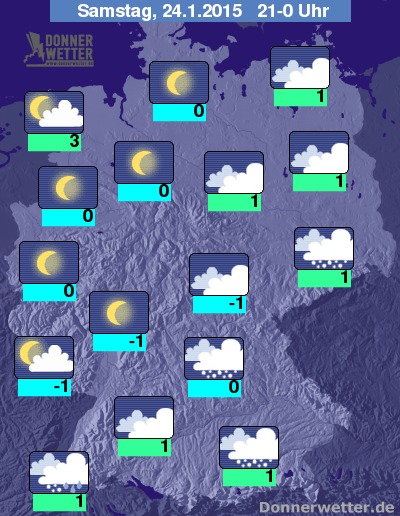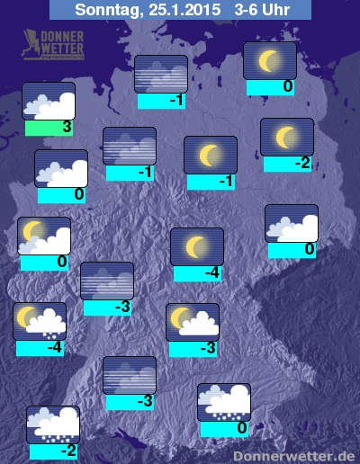 In der Nacht zum Sonntag fällt besonders im Süden, aber auch im Osten anfangs noch Schnee, im Laufe der zweiten Nachthälfte lassen die Schneefälle dort meist nach und nur am Alpenrand schneit es weiterhin teils langanhaltend. In den anderen Landesteilen ist es dagegen häufig locker bewölkt oder auch sternenklar, gebietsweise aber auch trüb, stellenweise bildet sich Nebel. Im Westen und Nordwesten ziehen zum Morgen hin wieder dichte Wolken auf und es bilden sich Schnee-, Schneeregen- oder Regenschauer, sonst bleibt es weitgehend trocken. Die Temperatur sinkt auf 3 Grad im Ammerland und bis -4 Grad im Coburger Land.