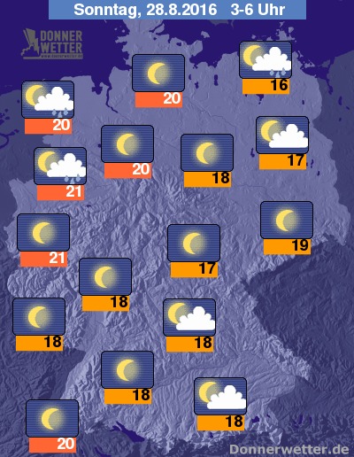 In der kommenden Nacht ziehen über den Nordwesten und die Küstengebiete von Nord- und Ostsee häufig dichte Wolken hinweg, dabei bilden sich gebietsweise Schauer und lokal sind auch Gewitter möglich. Teils dichte Wolken mit vereinzelten Schauer und Gewitter sind auch am Alpenrand möglich, im großen Rest des Landes präsentiert sich der Himmel hingegen meist sternenklar und es bleibt trocken. Die Temperatur sinkt auf tropisch warme 21 Grad in Aachen und bis etwa 16 Grad an der Müritz.