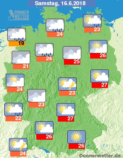 Heute ist es im Süden und Osten meist heiter und trocken. Im übrigen Bundesgebiet ziehen jedoch überwiegend dichte Wolken durch, die hier und da Schauer und selten auch Gewitter bringen, sonst bleibt es weitgehend trocken. Die Temperatur erreicht 19 Grad an der Nordsee und bis 27 Grad in der Lausitz.