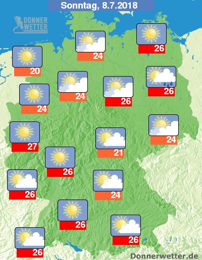 Am Sonntag ist es über den westlichen Landesteilen verbreitet sonnig. Im Osten ist es zum Teil heiter, teils ziehen aber auch dichtere Wolken durch, dabei bleibt es meist trocken, sonst ist es heiter bis wechselnd bewölkt und trocken. Die Temperatur steigt auf 20 Grad an der Nordseeküste und bis 27 Grad entland des Ober- und Mittelrheins.