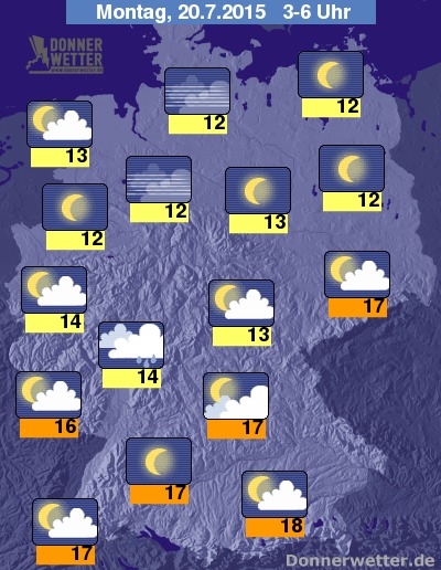 In der Nacht zum Montag zeigt sich der Himmel über der Nordhälfte Deutschlands überwiegend sternenklar, hier und da können ein paar Wolken durchziehen, dazu bleibt es trocken. Weiter nach Süden ist es meist locker oder aufgelockert bewölkt und trocken, vor allem entlang des Mains halten sich aber auch teils dichte Wolken, die etwas Regen bringen können. Die Temperatur sinkt auf 17 Grad im Kraichgau und bis 12 Grad in Vorpommern.