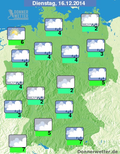 Der Dienstag wird ebenfalls meist wolkenverhangen und nasskalt, dazu fällt neben Regen auch gebietsweise Schneeregen. Die besten Chancen auf Sonne bieten sich an der Nordsee, sonst bleiben Auflockerungen eher selten. Die Temperatur steigt auf kühle 2 bis 7 Grad.