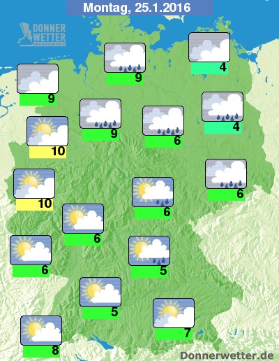 Am Montag bleibt der Himmel im Norden und Osten bedeckt und es fällt zeitweise Regen, über der Südwesthälfte ist es zumeist locker bis aufgelockert bewölkt, zum Teil auch trüb, dabei bleibt es weitgehend trocken. Es werden 4 bis 10 Grad erreicht.