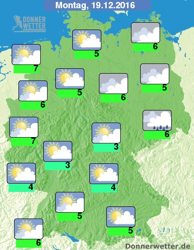 Am Montag bleibt die Wolkendecke vom Nordosten bis in den Osten meist verschlossen, dabei fällt im Osten anfangs noch gebietsweise Regen, sonst bleibt es trocken. In den anderen Landesteilen ist es teils locker, teils aufgelockert, anfangs auch noch stark bewölkt, jedoch trocken. Von Südwesten her setzt sich im Tagesverlauf sonniges Wetter durch. Die Temperatur steigt auf 3 bis 7 Grad.