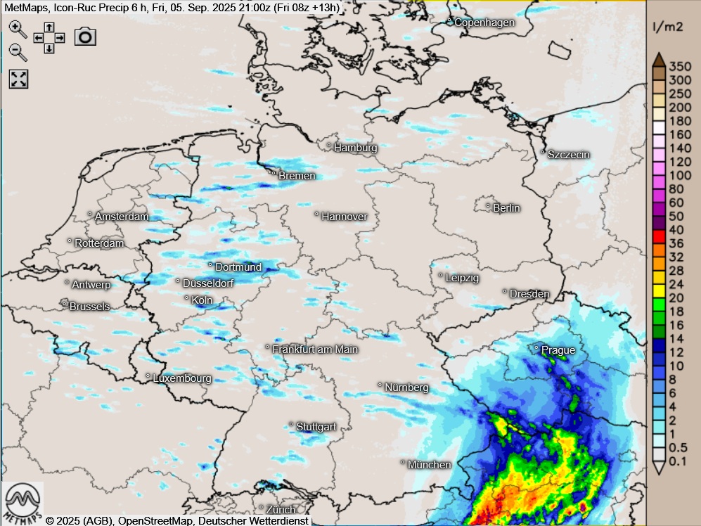 Die Lufttemperaturen am Freitagnachmittag (16:00 Uhr) sowie die Sechs-Stunden-Regenmengen bis 21:00 Uhr nach ICON / ICON-RUC: