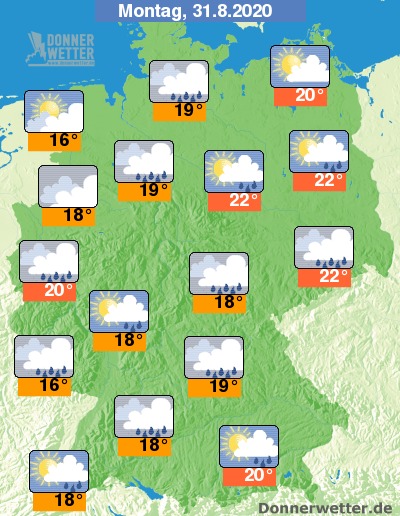 Der Sommer 2020 geht heute in weiten Landesteilen wechselhaft zu Ende. Verbreitet bleibt der Himmel am Montag stark bewölkt oder es ist bedeckt, freundlichere Phasen sind im Tagesverlauf vor allem an den Küsten, im Nordosten sowie südlich der Donau zu erwarten. Vielerorts muss dabei mit Schauern gerechnet werden.