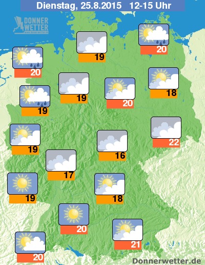 Am Nachmittag zeigt das Wetter sich an der Ostseeküste und im Nordwesten regnerisch, selten kommt die Sonne zum scheinen. Im Südwesten zeigt das Wetter sich meist sonnig, teils auch heiter. An der Nordseeküste und in der Sächsischen Schweiz wird der Himmel in den Nachmittags Stunden überwiegend von Wolken bedeckt sein.