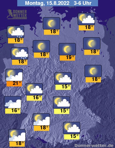 In der bevorstehenden Nacht klart der Himmel im Norden und Osten der Republik verbreitet auf, dazu bleibt es trocken. Weiter nach Westen und Süden hin ziehen hingegen oft viele und zum Teil auch dichte Wolken durch, dabei bleibt es weitgehend trocken. Die Temperatur sinkt auf 21 Grad in Köln und 15 Grad in Nürnberg.