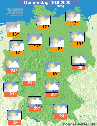 Die Höchsttemperaturen liegen in der Nordhälfte, sowie im Bereich der Mittelgebirgen meist nur zwischen 16 und 20 Grad, nach Süden und Südwesten hin können wieder angenehme 20 bis 25 Grad gemessen werden.