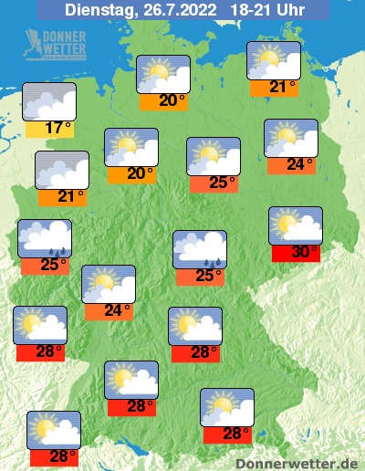Heute Nachmittag ist es über der Nordhälfte oft stark bewölkt, teils zeigen sich auch Aufheiterungen, allerdings bilden sich gebietsweise Schauer. Im übrigen Land ist es zum Großteil heiter bis sonnig und trocken, an den Alpen bilden sich jedoch örtliche Schauer und Gewitter. Die Temperatur liegt bei frischen 17 Grad an der Nordsee und bis 28 Grad in der Lausitz.