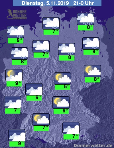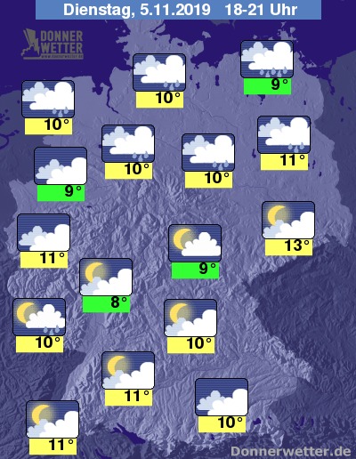 Am Abend fällt im Norden aus kompakten Schichtwolken zeitweise Regen, Richtung Ostsee auch intensiver. Im übrigen Land bleibt es wechselnd bewölkt, doch Schauer treten nur vereinzelt auf. Teilweise zeigen sich auch mal für längere Zeit die Sterne.