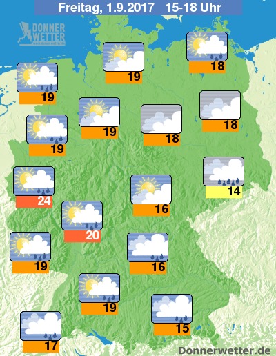 Freundliche Abschnitte vor allem im Westen, um 14 bis 24 Grad C in der Spitze.