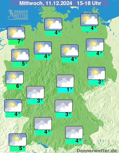 Am Mittwochnachmittag zeigt sich der Himmel über weiten Landesteilen bedeckt oder es ist nebelig-trüb; Auflockerungen sind am Nachmittag vor allem im Norden, Westen und Nordwesten des Landes möglich. Es bleibt meist trocken, etwas Sprühregen ist vor allem an den Nordrändern der östlichen Mittelgebirge sowie in Küstennähe aber möglich.