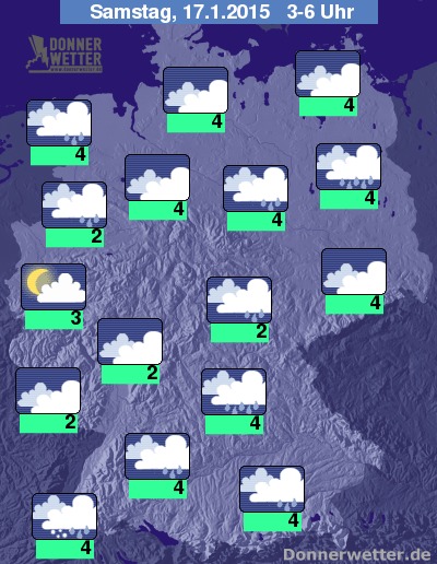 In der Nacht zum Samstag verlagert sich der Schwerpunkt des Regens auf die Südosthälfte der Republik, regional fällt auch Schneeregen oder Schnee, dabei bleibt die Wolkendecke geschlossen. Im Westen und Nordwesten kann es gebietsweise auch mal etwas auflockern, jedoch fällt auch hier zeitweise Regen, hier und da auch Schneeregen. Die Tiefstwerte liegen bei verbreitet 4 Grad und bis rund 2 Grad am Westerwald.