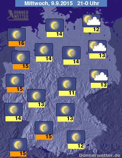 In der Nacht zum Donnerstag zeigt sich besonders über der Südhälfte Deutschlands ein oft sternenklarer Himmel, gebietsweise halten sich aber auch einige, teils dichtere Wolken. Weiter nach Norden hin ist die Bewölkung meist locker oder aufgelockert bewölkt. Es bleibt landesweit trocken. Die Temperatur sinkt auf etwa 12 Grad in Rostock und um 7 Grad im Chiemgau. Es bilden sich stellenweise Nebel oder Dunst.