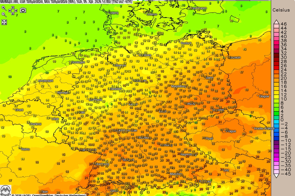 Am Ostersonntag ziehen von der Nordsee her dichte Wolken bis in die Landesmitte. Besonders im Nordwesten und Norden fällt dabei zeitweise Regen. Im weiteren Verlauf lockert es von der Nordsee her wieder etwas auf. Die Höchsttemperaturen liegen dort zwischen 11 und 15 Grad.