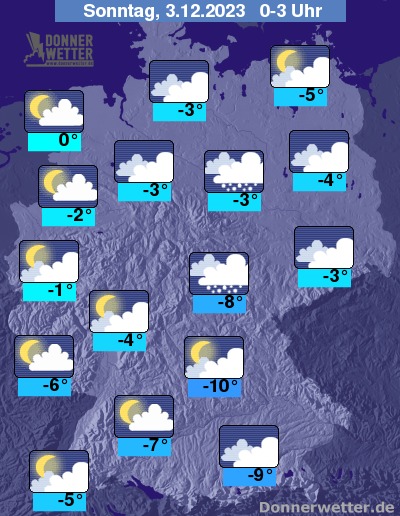In der Nacht auf Sonntag zeigt sich der Himmel über der Nordosthälfte stark bewölkt, dabei sind einzelne Schneeschauer möglich. Im Westen und Südwesten ist es häufig aufgelockert bewölkt und es bleibt meist trocken.