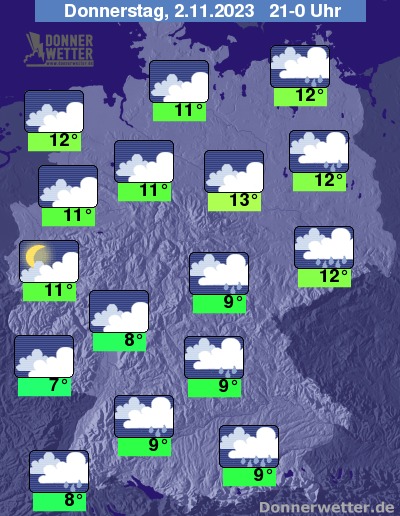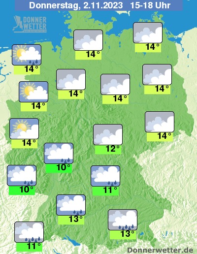 In den Nachmittags- und Abendstunden zeigt sich der Himmel vielerorts stark bewölkt oder bedeckt, Lichtblicke gibt es im äußersten Nordwesten und Westen. Während es in der Nordhälfte Deutschlands überwiegend niederschlagsfrei bleibt, muss im Süden verbreitet mit teils kräftigen Niederschlägen gerechnet werden.