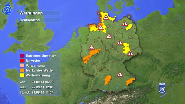 Aktuelle bestehen Warnungen vor Starkregen und Gewitter. Im Norden gibt es Windböen