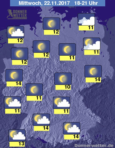 Heute Abend ist es im Nordosten noch stark bewölkt, sonst jedoch verbreitet nur noch locker bewölkt und häufig auch sternenklar, dazu bleibt es im ganzen Land trocken. Die Temperatur liegt bei 10 bis 14 Grad.