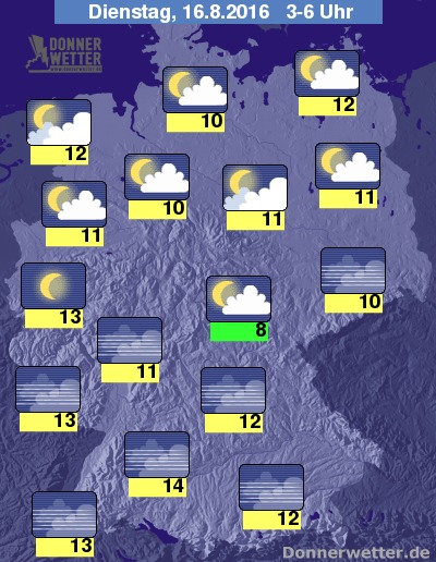 In der Nacht zum Dienstag ziehen über den Norden oft lockere Wolkenfelder hinweg, hier und da ziehen auch noch mehr Wolken durch. Von der breiten Mitte bis in den Süden Deutschlands ist der Himmel größtenteils sternenklar, nur hier und da sind ein paar Wolken möglich. Es bleibt landesweit trocken. Die Temperatur sinkt auf 14 Grad in Stuttgart und bis etwa 8 Grad im Thüringer Becken.