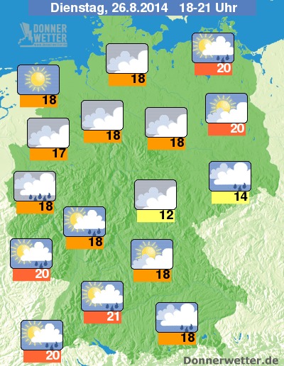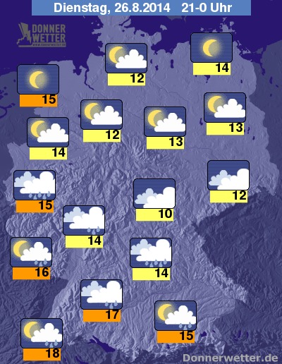 Munteres Weiterregnen im Süden und Westen dann auch in der ersten Nachthälfte, Tiefstwerte um 18 bis 14 Grad.. Im Norden bleibt es dagegen bei lockerer Bewölkung, an den Küsten teils sternenklarem Himmel häufig trocken, hier Tiefstwerte um 15 bis 12 Grad C.