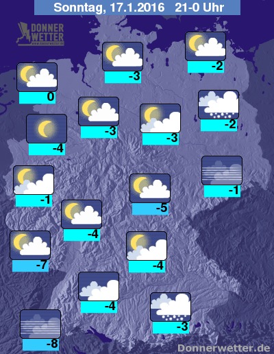 In der Nacht zum Montag ist im Nordseeumfeld gebietsweise Schnee oder Schneeregen möglich, dabei kann es glatt werden! In den östlichsten Landesteilen ist es häufig stark, teils auch aufgelockert bewölkt und überwiegend trocken. Im großen Rest des Landes ist es hingegen meist sternenklar, teils aber auch neblig-trüb, jedoch trocken. Es besteht Glättegefahr durch Rauhreifbildung! Die Temperatur sinkt auf -1 Grad in Emden und bis -11 Grad im Oberrheingraben.
