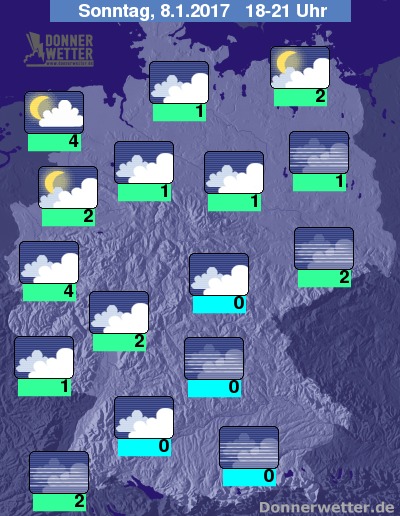 Heute Abend lockert es im Umfeld von Nord- und Ostsee meist auf, im übrigen Land ist es verbreitet stark bewölkt oder neblig-trüb, jedoch fällt nur selten Schnee, Schneeregen oder Regen. Stellenweise kann es glatt sein! Die Abendtemperatur liegt zwischen 0 und 4 Grad.