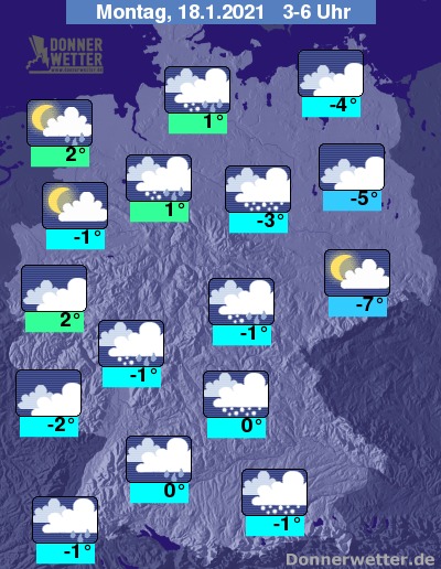 Am Montag halten sich von Bayern bis nach Brandenburg dichte Wolken und es fällt zeitweise Schnee, teils auch Schneeregen. Weiter nach Westen hin ist es oft trüb oder stark bewölkt, vor allem im Südwesten und Nordwesten zeigen sich aber auch oft heitere Abschnitte, dabei bleibt es trocken. Die Temperatur steigt auf 0 Grad im Saargau und bis 5 Grad im nördlichen Emsland.