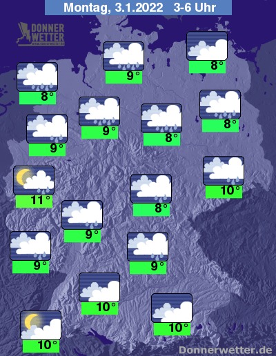 Am Montag ziehen weitgehend dichte Wolken durch, dabei zieht im Tagesverlauf von Westen her neuer Regen durch. Die Temperatur steigt auf 8 Grad in Erfurt und bis 12 Grad in Freiburg. An den Küsten weht noch ein oft stürmischer Wind.
