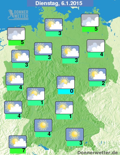 Am Dienstag ist es verbreitet locker oder aufgelockert bewölkt, dichte Wolken halten sich im äußeren Norden und im Nordosten des Landes, dazu bleibt es aber trocken. Häufig auch sonnig wird es in weiten Teilen Süddeutschlands. Die Werte steigen auf 0 bis 7 Grad.
