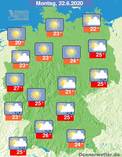 Am Montag ist es verbreitet heiter bis sonnig, im Süden und Osten entwickeln sich jedoch im Tagesverlauf lokal Schauer und vereinzelt auch Gewitter, sonst bleibt es aber trocken. Die Temperatur steigt auf 20 Grad an der Nordsee und bis 27 Grad im Rheinland.