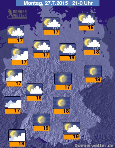 Heute Abend zeigt sich über dem Osten und Süden Deutschlands ein meist sternenklarer Himmel oder es ziehen nur lockere Wolken durch, dabei bleibt es trocken. Über den Westen, vor allem aber den Norden der Republik ziehen auch oft kompakte Wolken, die für einzelne Schauer, im Norden auch Gewitter führen können. Die Abendtemperatur liegt bei 19 Grad in Leipzig und 16 Grad am Hunsrück.